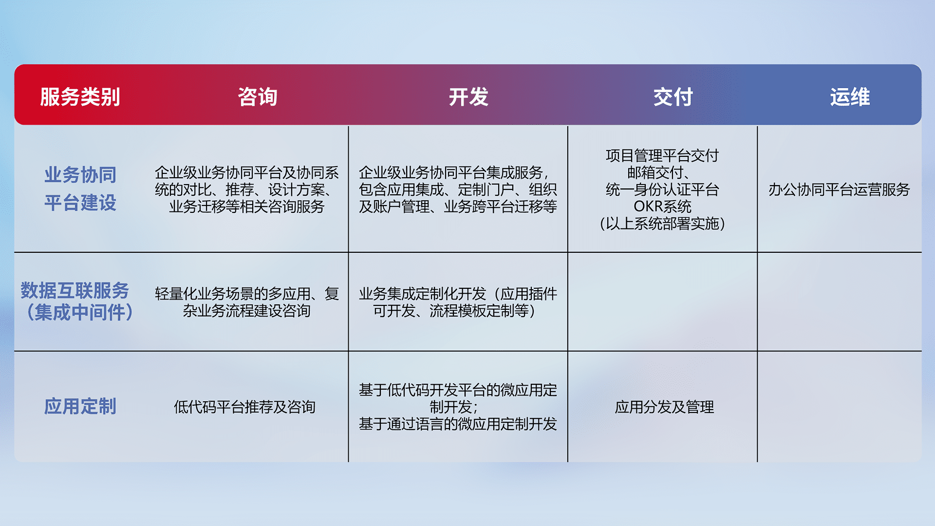 针对钉钉、、、、企微、、、IDaas等平台级产品提供产品的规划、、方案、、交付、、、、定制化开发等服务,,实现如统一协同办公、、、智能客户服务、、、、混合会议管理、、、智能数据查询、、等业务场景,,,实现数字化转型。。。。