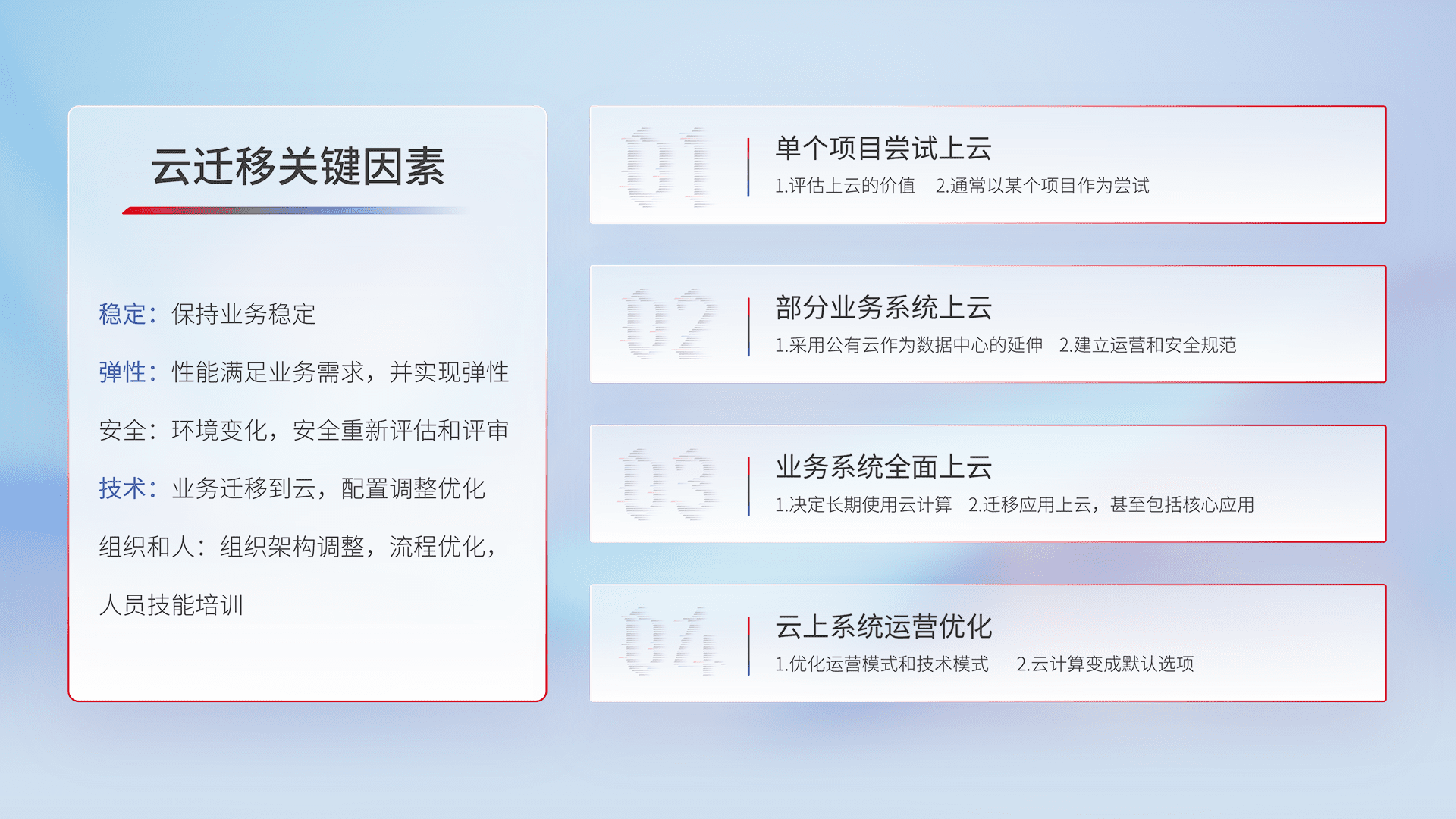 结合实际业务,,,,从规划设计、、、、云平台选型、、云原生改造、、、、数据迁移、、、、集成交付,,迁移全过程为客户识别最佳上云路径,,,做好风险识别管理,,设计网络架构、、、、身份权限、、、、安全审计合规、、操作审计、、、、日志审计、、、、监控告警策略、、、多站点容灾设计等,,,,对云上基础设施进行整体规划,,,提升IT治理水平,,,,以满足弹性、、、高可用、、、、高性能的需求。。
