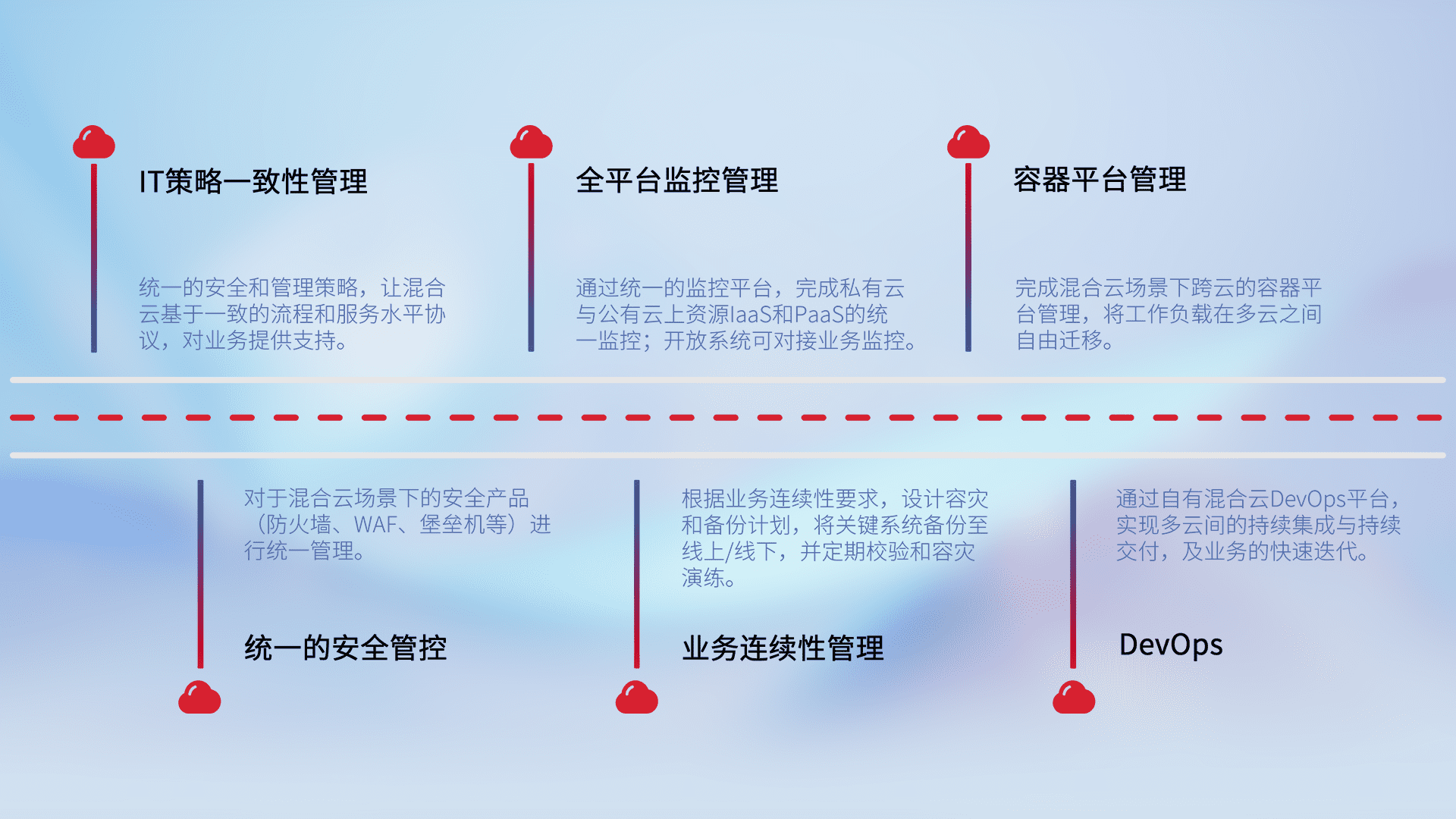 通过多云纳管,,以统一的资源数据模型把客户的云资源进行抽象和封装,,,进而实现对多云资源的统一操作,,保障云资源管理的可靠性、、、稳定性与可用性。。。。量身定制化运维内容,,,配置、、、开发运维、、补丁管理、、备份、、监控、、、认证和访问管理、、、、审计和日常巡检等,,,保障在用云过程中的可靠度,,,,稳定度以及高可用率。。。